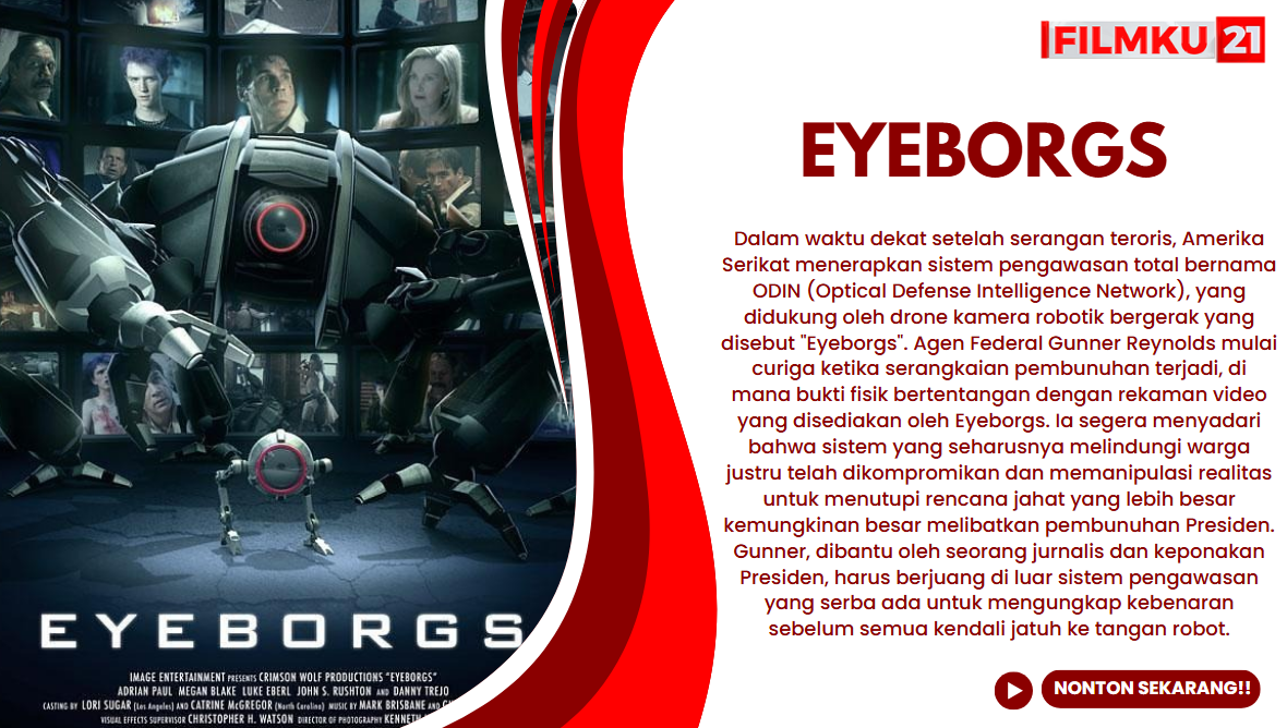 FILMKU21 Eyeborgs (2009) memperkenalkan kita pada karakter utama, Agen Federal Gunner Reynolds (diperankan oleh Adrian Paul), seorang agen Departemen Keamanan Dalam Negeri yang sangat percaya pada teknologi pengawasan. Karakter pendukung kunci meliputi Barbara Hawkins, seorang jurnalis yang gigih mencari kebenaran, dan Jarett Hewlett, keponakan Presiden yang seorang musisi punk rock dan secara tidak sengaja terjerat dalam konspirasi. Ada pula G-Man (diperankan oleh Danny Trejo), pemilik toko musik yang memiliki pandangan skeptis terhadap sistem baru ini. Bersama-sama, tim yang tidak terduga ini harus menghadapi ancaman yang berasal dari dalam sistem yang seharusnya melindungi mereka.