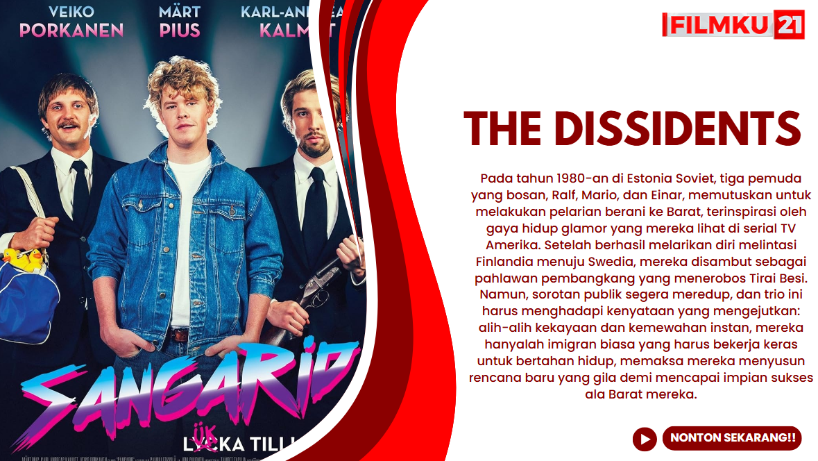 Dalam FILMKU21 komedi-aksi Estonia, The Dissidents (2017), kita diperkenalkan pada trio sahabat yang memiliki mimpi besar tentang “Dunia Bebas”: Ralf (diperankan oleh Märt Pius), Mario (Karl-Andreas Kalmet), dan Einar (Veiko Porkanen). Mereka adalah pemuda-pemuda yang bosan dengan kehidupan suram di bawah kekuasaan Soviet di Estonia pada tahun 1980-an. Ketiga peran utama ini, yang terinspirasi oleh gaya hidup glamor yang mereka lihat di acara TV Barat seperti Miami Vice dan Knight Rider, memutuskan untuk menentang Tirai Besi demi mencari kegembiraan, kemewahan, dan kebebasan sejati yang mereka yakini ada di Swedia.