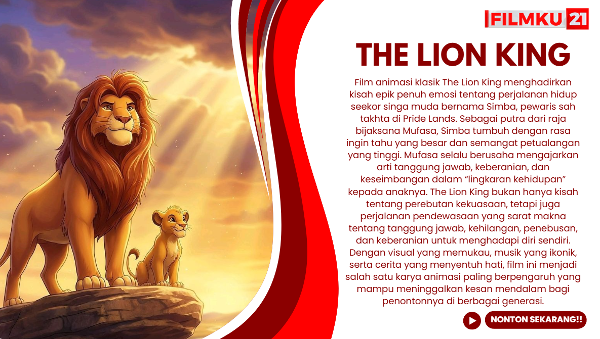 Film animasi klasik The Lion King menghadirkan kisah epik penuh emosi tentang perjalanan hidup seekor singa muda bernama Simba, pewaris sah takhta di Pride Lands. Sebagai putra dari raja bijaksana Mufasa, Simba tumbuh dengan rasa ingin tahu yang besar dan semangat petualangan yang tinggi. Mufasa selalu berusaha mengajarkan arti tanggung jawab, keberanian, dan keseimbangan dalam “lingkaran kehidupan” kepada anaknya.