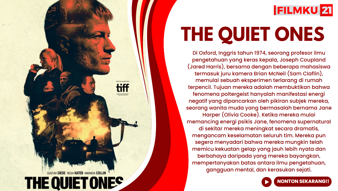 FILMKU21 The Quiet Ones (2014) memperkenalkan penonton pada sekelompok karakter yang terobsesi pada batas antara sains dan supranatural. Tokoh utamanya adalah Profesor Joseph Coupland (diperankan oleh Jared Harris), seorang ahli parapsikologi dari Universitas Oxford yang sinis dan bertekad membuktikan bahwa fenomena poltergeist hanyalah manifestasi energi negatif pikiran manusia. Coupland dibantu oleh tim mahasiswanya: Brian McNeil (Sam Claflin), seorang juru kamera yang merekam seluruh eksperimen; serta asistennya Krissi Dalton (Erin Richards) dan Harry Abrams (Rory Fleck-Byrne). Subjek penelitian mereka yang paling penting adalah Jane Harper (Olivia Cooke), seorang wanita muda yang dianggap terganggu secara psikologis dan diyakini menjadi pusat dari aktivitas paranormal yang berbahaya.